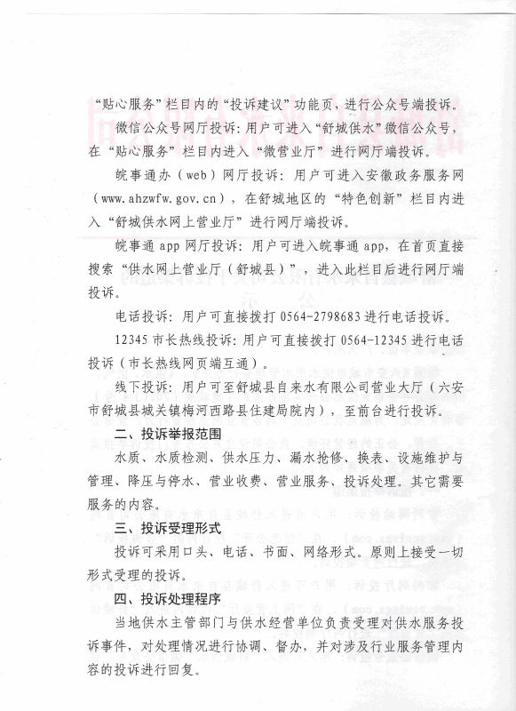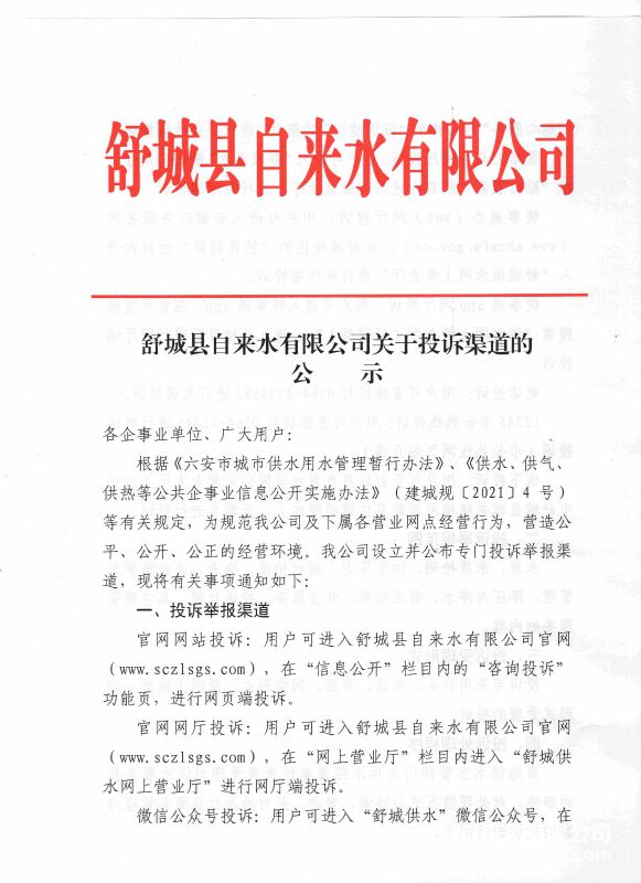 舒城縣自來(lái)水有限公司關(guān)于投訴渠道的公示